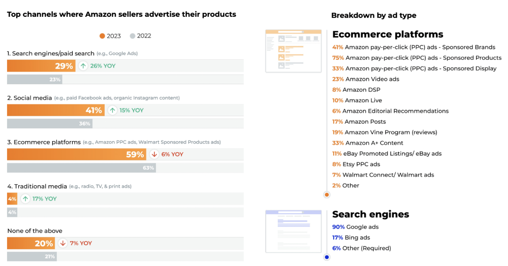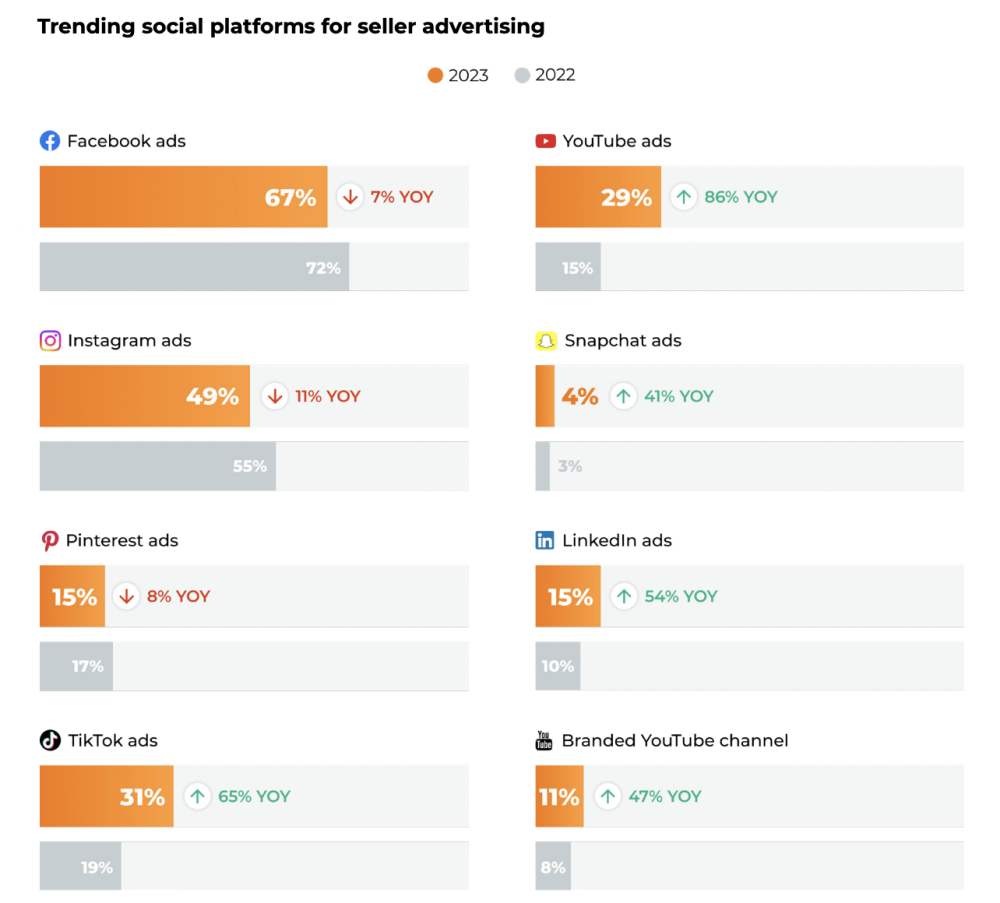 Amazonセラーが自社プロダクトをプロモーションしている主な広告チャネルにおいて、AmazonプラットフォームのようなECプラットフォームが引き続き最もポピュラーでありつつ、ソーシャルメディアが昨対で15%ほど伸びてNo.2のポジションを堅持しているのが興味深いですね。(例:2022年は36%のセラーがソーシャルメディアを利用して自社プロダクトの広告を打っていたが、今年は41%まで伸びている)