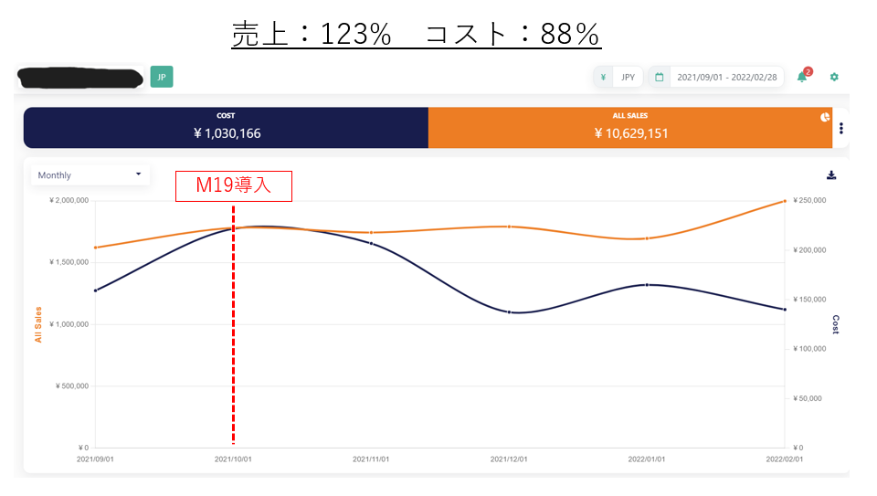 導入後5ヶ月経過した今年2月末時点で、9月比で売上123%/コスト88%という改善実績となっております。
