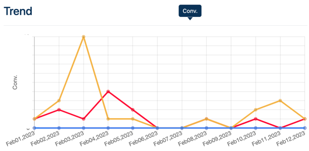 2月は、このECクライアントにとって閑散期。実際、2022年2月1日〜12日のGoogle広告ROASは200%ほどでした。それが2023年同一期間で784%まで改善しました、1年で4倍弱ROASが改善していることになります。しかしながら、次のコンバージョンの山とGoogle Analytics上のコンバージョンの内訳を分析したところ、メルマガで配信しているオンライン・オフラインの販促キャンペーン内容の影響が大きい事が分かりました。