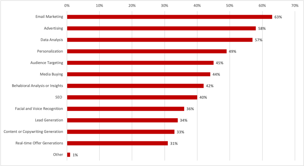 実際、Capterra(世界最大級のSaaS比較サイト)が実施した調査によれば、2021-2022年時点で世界的には約3割のマーケッターが既にコンテンツ作成AIソリューションを利用しているそうです。広告・データ分析では、それぞれ58%、57%のマーケッターがAIソリューションを活用しています。