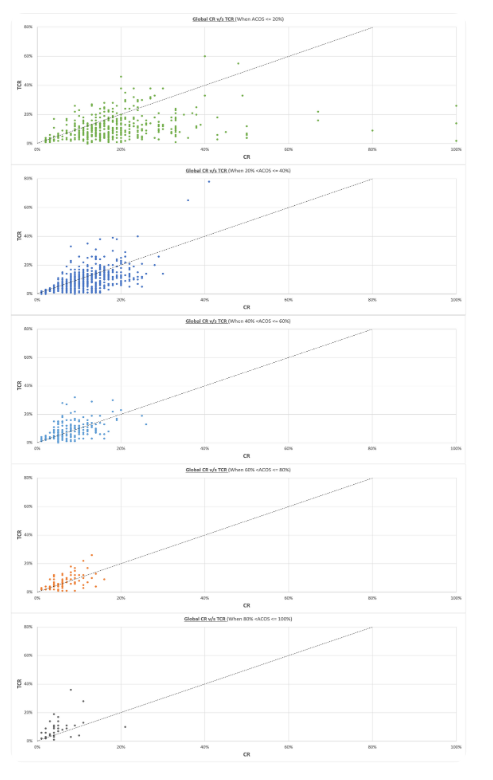 ・ACOS が高い ASIN の方が、コンバージョン率 (CR と TCR の両方)が低い