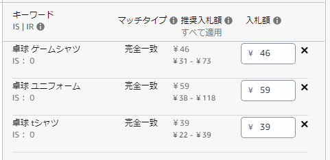 たとえば、「卓球ユニフォーム」の競合を確認するために、推奨入札単価が 46円の「卓球 ゲームシャツ」、59円の「卓球 ユニフォーム」、39円の「卓球 tシャツ」の 3 つのキーワード バリエーションを選択しました。