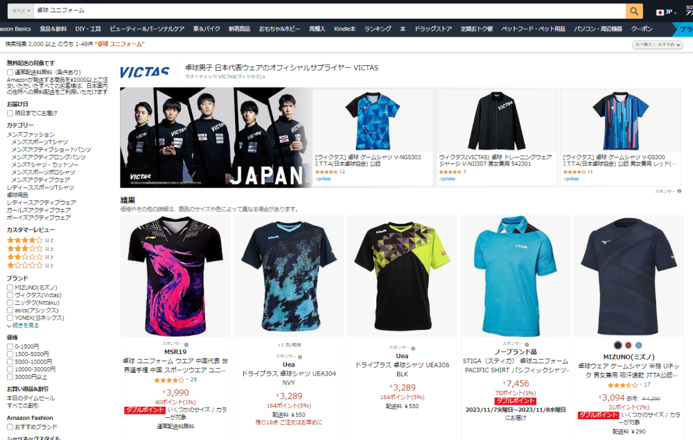 (2つ目)特定のキーワードで誰が競合しているかを特定することです。そのために、Amazon でキーワードを入力し、どのブランドがそれらのキーワードに投資しているかを直接確認します (図 2)。卓球ユニフォームの例に従うと、「卓球 ユニフォーム」の場合、MSR19 と Uea のスポンサープロダクト広告が上位の表示されています。