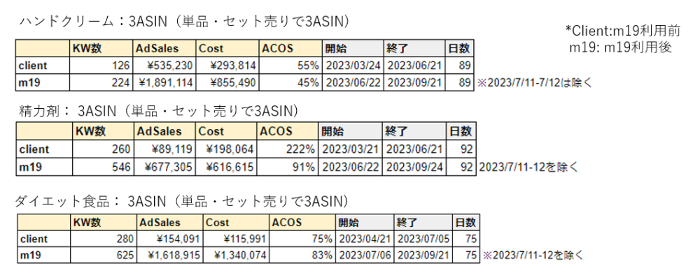 m19利用前後約3ヶ月の分析結果を見たところ、なんと、KW数・広告売上ともに大きく改善しています。今回はm19利用後にプライムデーがあったので、その期間(2023/7/11~7/12)は除いています。m19利用してまだ3ヶ月なのでこれからさらに売上が伸びてくると思います。(ちなみに、指名系も伸びていました!)