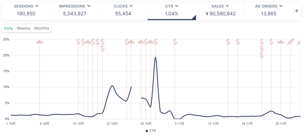 これは、ASINに関連するプロモーション、ディスカウント、またはその他(画像や価格など)の変更など、重要なイベントのタイムラインを表示します。A10アルゴリズムによって、これらの変更がASINのパフォーマンスとセールスにどのように影響するかを理解することができます。たとえば、あるASINの売上が減少した場合、ASINイベントのタイムラインを確認すると、価格や画像を変更したためかもしれません。さらに、この機能をA/Bテストに使用して、ユーザーが最も好むものを特定することもできます。この方法でCTRを向上させることができます。