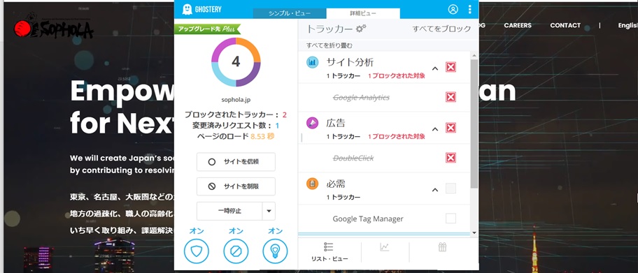 Ghostery は、Web上で表示される広告をブロックしたり、広告などの追跡(トラッカー/クッキー)を阻止するためのツールです。Google ChromeやFirefoxにアドオンとしてインストールできる拡張機能です。Ghostery を利用すると、Webサイトの「アクセス解析」や「ソーシャルメディア」、「広告」に関するトラッカー情報が表示されます。そのため、特定のWebサイトが「どんなサービスを利用しているのか?」、「どんな広告配信を利用しているのか?」を確認できます。競合調査に利用することが可能です。