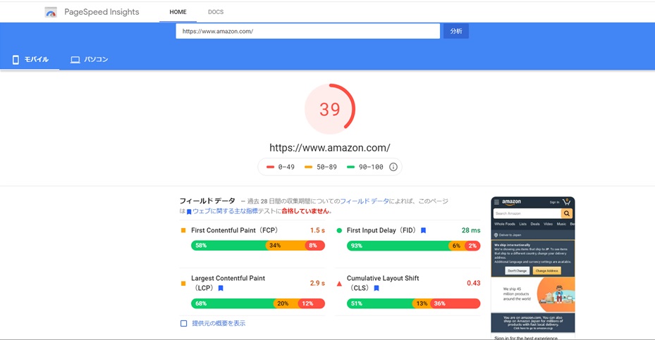 PageSpeed Insights では、特定のサイトのモバイル端末/パソコン向けのページの実際のパフォーマンスに関するレポートと、ページの改善に関する情報を確認できます。速度スコア(ページスピード)からどんな項目(画像サイズ/サーバ応答スピード/画像遅延読み込みなど)を改善すると良いのかを示してくれるので、Webサイトの改善を行う際のポイントを探すことができます。