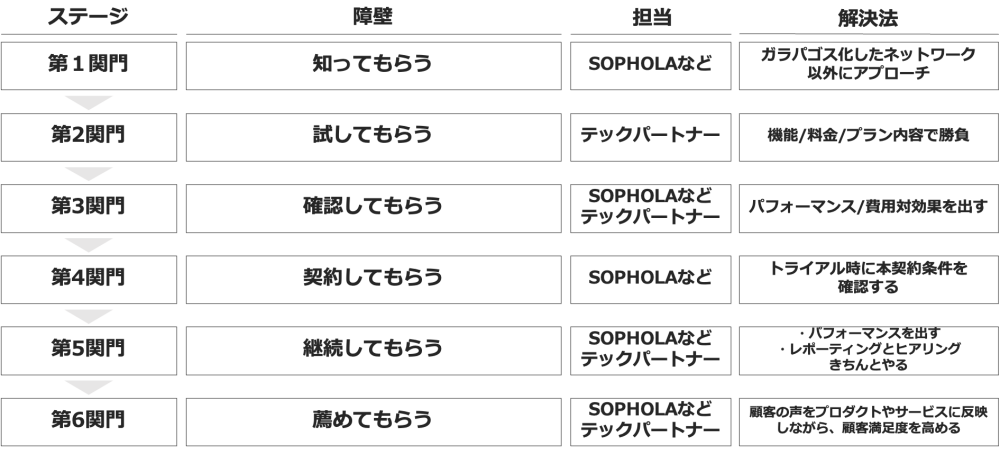 そして契約締結後、第5関門として現れるのが「継続してもらう」です。テックパートナーが推奨する形で正しく設定が行われ、想定以上のパフォーマンスを継続的に出せているかがまず重要になってきます。そして、その結果をキチンとクライアントに理解してもらい、プロダクト価値を評価してもらうことも対になるポイントですね。同時に、「更にプロダクト・サービスで改善すべき点がないか?」を定期的にヒアリングすることで弊社/テックパートナー/セールスパートナーそれぞれの改善余地を探ることで、満足度を高めていくことができます。