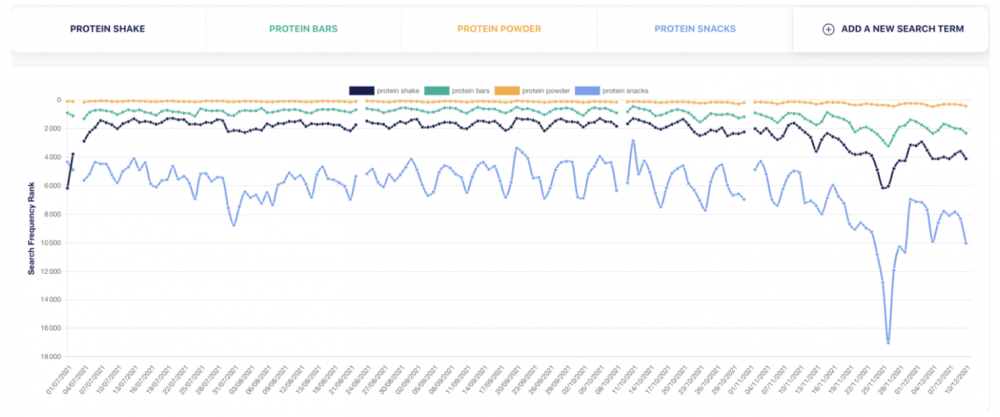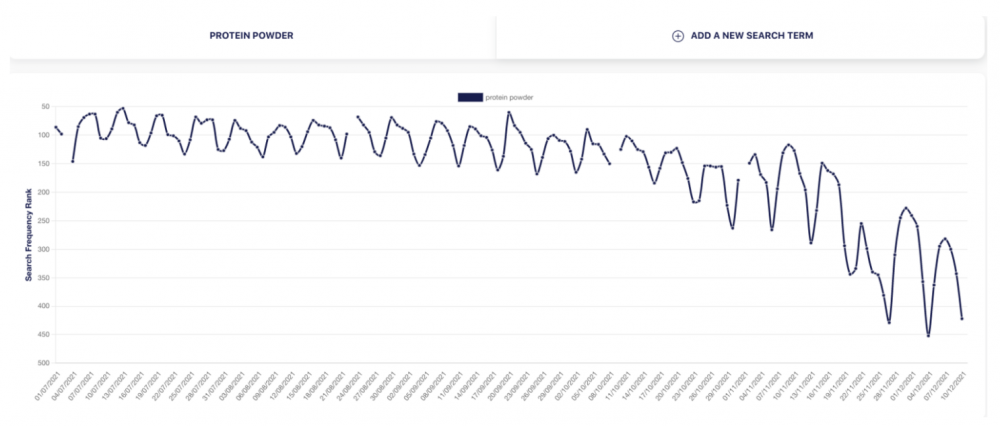 「PROTEIN POWDER」を例に見てみますと、徐々に検索頻度率が悪化していることが分かります。トレンドをしっかり把握することで、こういったことも、販売戦略などに有効活用できます。