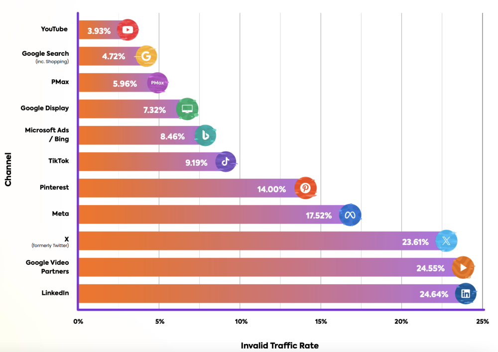 Compared to previous periods, the average IVT rate for Google ads (including search, display, P-Max, and YouTube ads) was 5.5%, while non-Google ads (Meta, Bing, LinkedIn, TikTok, X/Twitter, and Pinterest) had a significantly higher rate of 17.5%, more than three times higher. Below are the average IVT rate for each advertising platform/campaign: