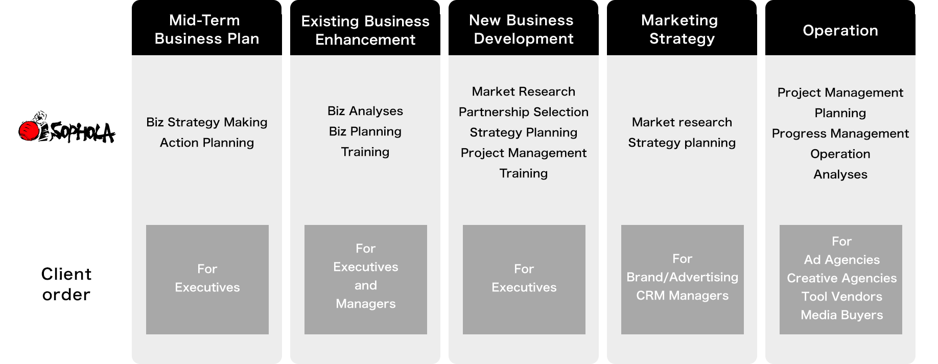 Our business consulting entails “1. Mid-Term Business Plan” / “2. Existing Business Enhancement” / “3. New Business Development” for our clients such as ad agecies and advertisers.