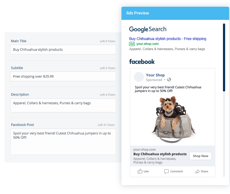 Use the power of AI technology to automatically create and optimize ads across Google, Facebook & Instagram, with an average ROI of 10X and success-based pricing