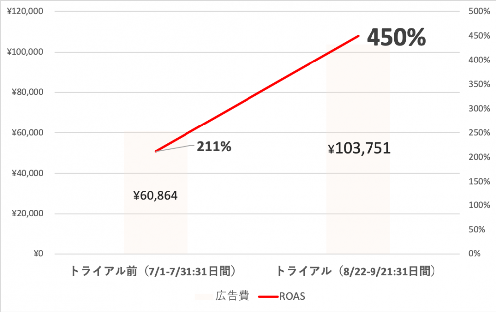 Googleショッピングで、広告アカウント全体でROAS(※):211%→450%という大幅な改善を実現しました。