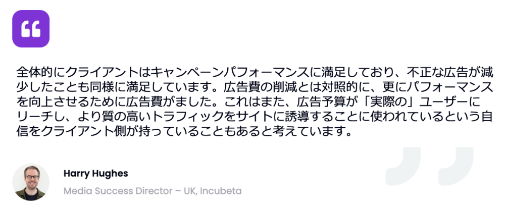 他では得られない堅牢なレベルのクリック課金型広告への保護をクライアントに提供します。そしてクライアントの限られた広告費から最大限のパフォーマンスを引き出そうとしていることを示していただければと思います。