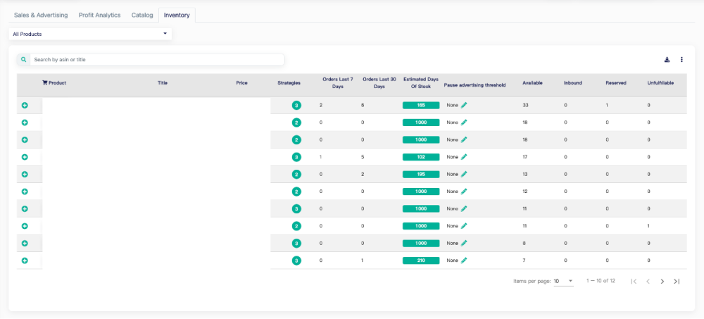 在庫レポートでは、各ASINの在庫の数量や金額を確認できます。(Amazon上表示価格の確認可能)商品グループによるフィルタリング、数量から金額への切り替え、またその逆も可能で、レポートをダウンロードすることもできます。