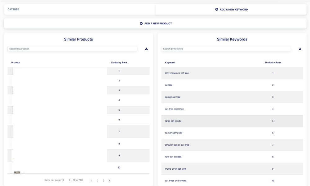 多くのクライアントから、「キーワードの競争力を比較する機能」が欲しいという要望がありました。そこで、Amazonの検索頻度率を毎日ダウンロードし、キーワードのランキングを時系列で比較するようにしました。キーワード抽出タブでは、キーワードを入力するか、新しい商品を追加することで、類似商品と類似キーワードを類似度ランクに基づいて比較することができます。