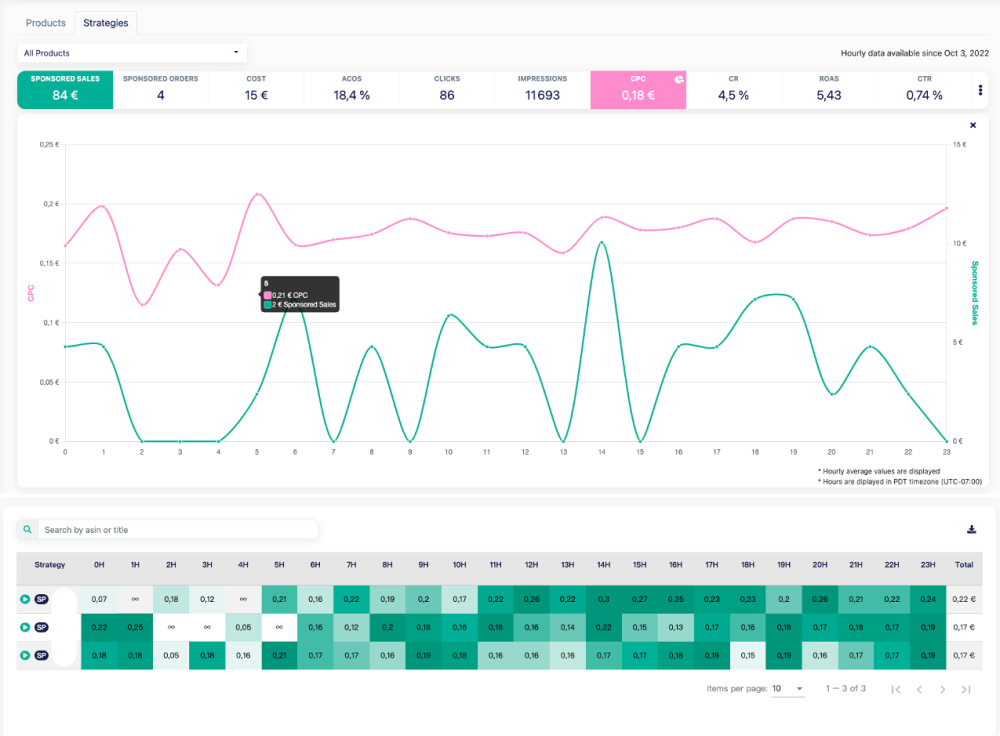 2022年夏には、Amazonがスポンサー広告の1時間ごとの統計情報をパートナーに提供し始めました。まず、US、CA、MXのマーケットプレイスで、そして他のマーケットのデータアクセスもパートナーに解放されたので、新しい機能を開発しました:時間帯別統計データ。これは、すべてのマーケットプレイス(インドを除く)に対応した新しい機能です。「時間帯別統計データ」では、プロダクトとストラテジーのパフォーマンスを1時間ごとにモニタリングでき、異なる時間帯に広告を一時停止したり、開始したりすることができます。時間帯は、各マーケットプレイスで設定されているタイムゾーンで表示されます。