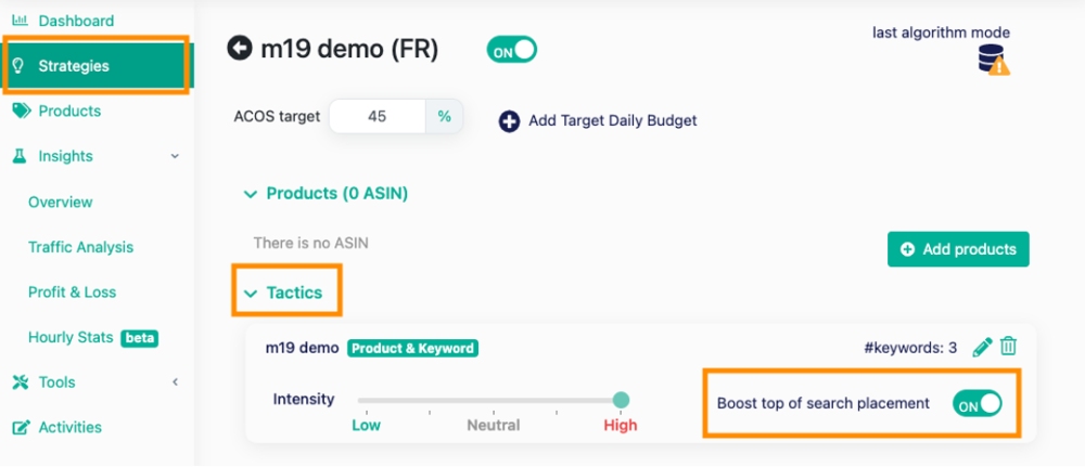 アルゴリズムは、広告が検索上位に表示されるように、現在の予算の200%の予算を増加させます。一方、目標ACOSは変わらないため、アルゴリズムは他のタクティクスの入札を下げる形になります。キャンペーン単位ではなく、キーワード単位で実施できるのがm19の強みとなります。