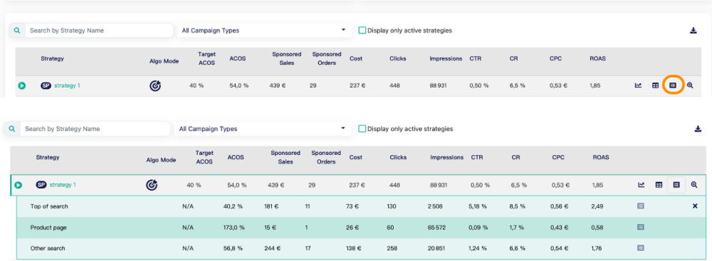 各キャンペーンのプレースメントをよりよく分析できるように、プレースメント統計機能も開発しました。アイコンをクリックしてプレースメントの詳細を開くと、検索上位、商品ページ、その他の検索でのストラテジーのパフォーマンスを確認できます。