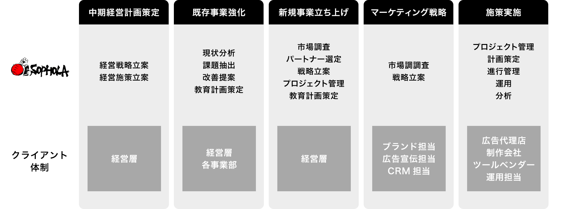 広告代理店や広告主の事業を「中期経営計画策定」/「既存事業拡大・強化」/「新規事業開発」の3つのポイントにおいて、コンサルティングを通じて支援。
