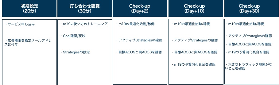 初期設定から1ヶ月間でどのように最適化具合を以下のフローで確認します。従来の手動や自動のアプローチと比べて、非常に少ない運用工数で安心してAmazonスポンサー広告の最適化を進めることができます。