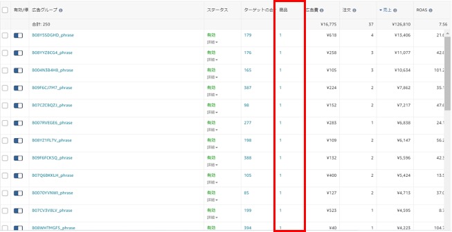 全キャンペーン、「広告グループ1つにつき1商品」を自動生成して1商品ごとに最適化ができます。複数の商品(広告)が同一広告グループ内に登録されている場合、Amazonではコンバージョン率の高い商品(広告)が優先的に表示されます。したがって、「広告グループ1つにつき1商品」は、出来るだけ多くの商品の露出機会を確保した上で、パフォーマンスに応じた最適化ができます。(商品数が多ければ多いほど、本自動設定機能は有効)