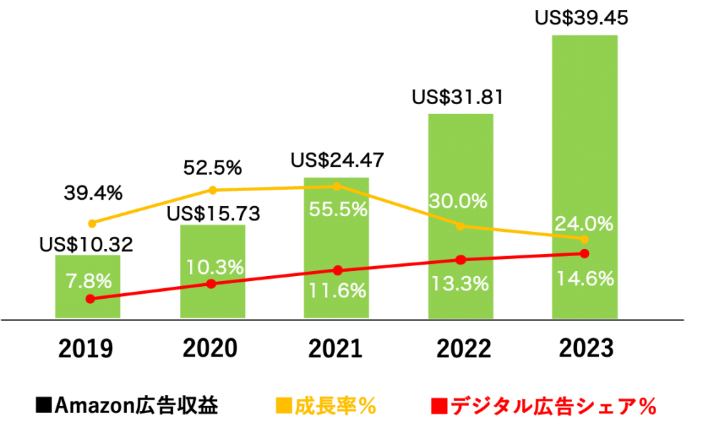 eMarketerの「Amazon Advertising 2021」レポートによると、GoogleやFacebookなどのTop2の米国デジタル広告企業に次いでNo.3のデジタル広告企業のポジションを確かなものにしています。2021年、Amazon USのデジタル広告収益は前年比+55.5%の成長を遂げ、2023年には米国内のデジタル広告マーケットシェアの14.6%を占めると予想されています。
