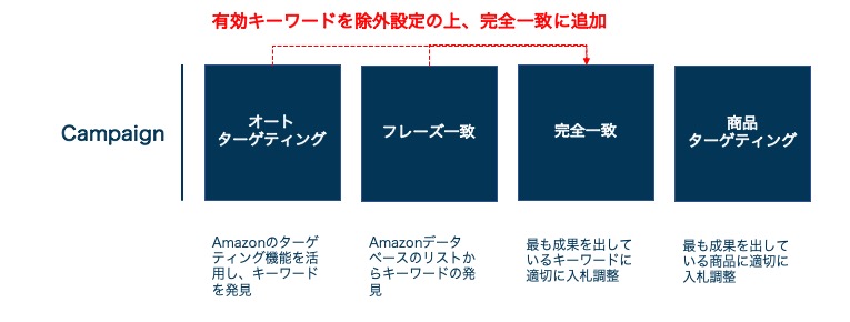 キャンペーンの運用によって有効キーワード/有効商品をオートターゲティング/フレーズ一致キャンペーンで除外キーワード設定しつつ、完全一致キャンペーン/商品ターゲティングキャンペーンに自動追加・入札調整をすることができます。