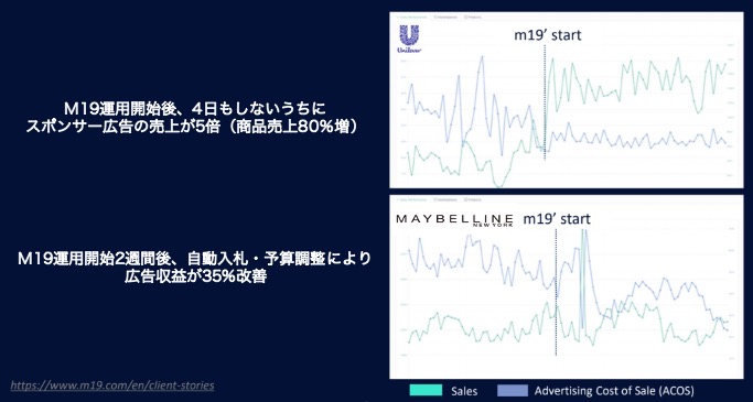 m19社は、Criteoシニアデータサイエンティストやフランス統括責任者、Google/Youtubeで Google/Youtube EMEAでリーダー的なポジションを担っていた方などCriteo/Google/Amazon出身の6人が創業した企業です。 特にダイナミック(動的)リターゲティング広告領域において日本でも非常に大きなシェアを持つCriteo出身者は4名で、全員が広告最適化アルゴリズムを開発するR&D部門に所属していました。時間をかけずに、Amazonスポンサー広告による売上/利益の拡大を実現するAIベースのSaaSを提供しています。すでにグローバル企業含め300社以上で利用されています。
