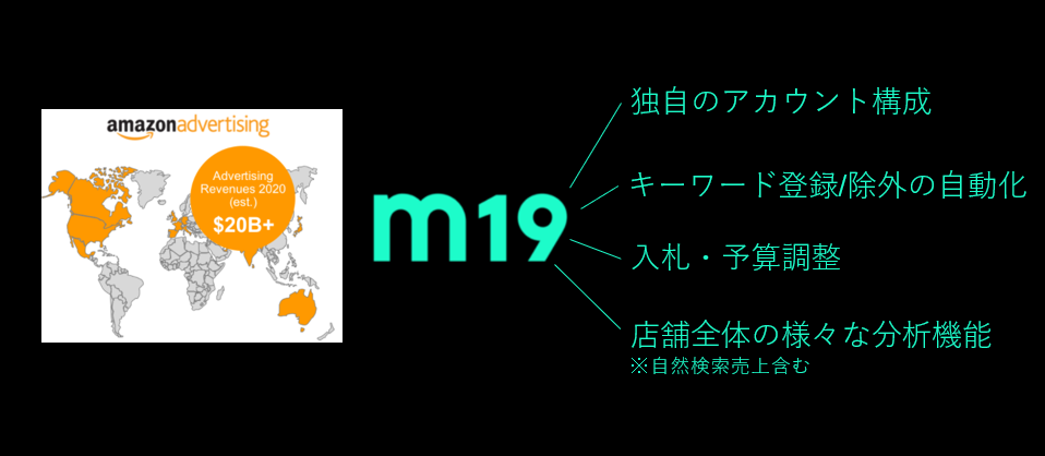 m19は、Amazonスポンサー広告主が抱えるこれらの課題を独自のテクノロジーで解決します。Amazonスポンサー広告(プロダクト、ディスプレイ、ブランド)の広告運用を以下のようにほぼ全自動設定および最適化することができます。