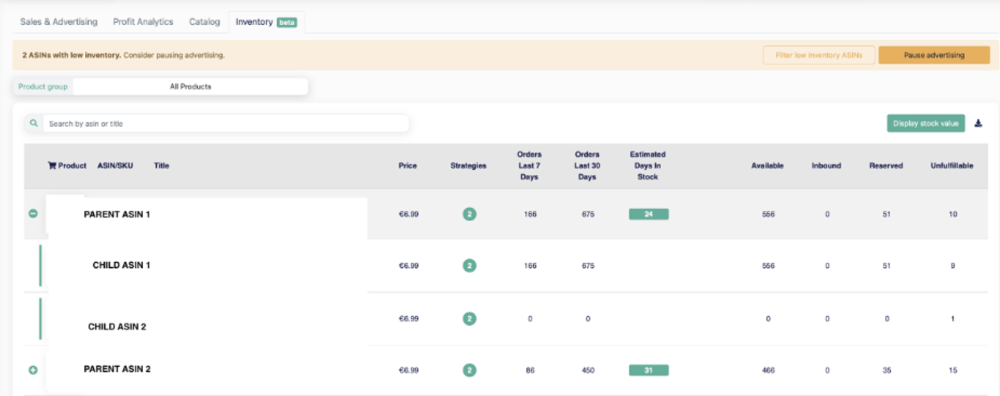 例えば在庫管理や損益管理機能などを一元で管理が可能。また、その他の様々な分析機能を用いて、SEO対策やカート獲得施策にも活用頂いています。Amazon広告の管理画面からは複数ダウンロードが必要なレポートも一括でのダウンロードが可能なので、工数も大幅に削減!